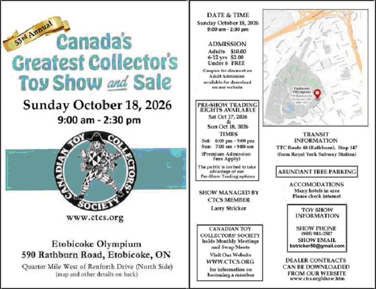 The Canadian Toy Collector's Society, with great pleasure, invites you to have a table or booth at our 53rd Annual "Canada's Greatest Collector's Toy Show & Sale", to be held on October 18, 2026 . Being the sponsors of the longest running and best established toy show in Canada we have continually set the standard.