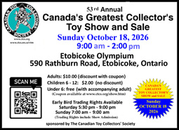 | To obtain a flyer for the October 18, 2026 "Canada's Greatest Collector's Toy Show & Sale" click the icon below: File will open in a new screen. Use browser back arrow to return to this page. | |